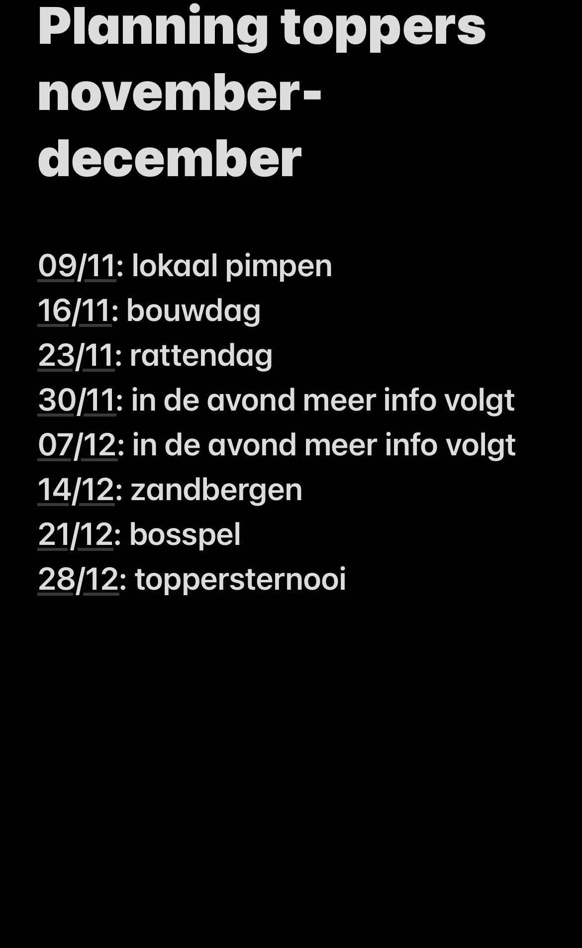 Elke zondag van 14u tot 19u voor jongens van het eerste en tweede middelbaar. Uitzonderlijk zullen wij in werkingsjaar 2025-2026 ook jongens van het derde middelbaar verwelkomen bij de Toppers!